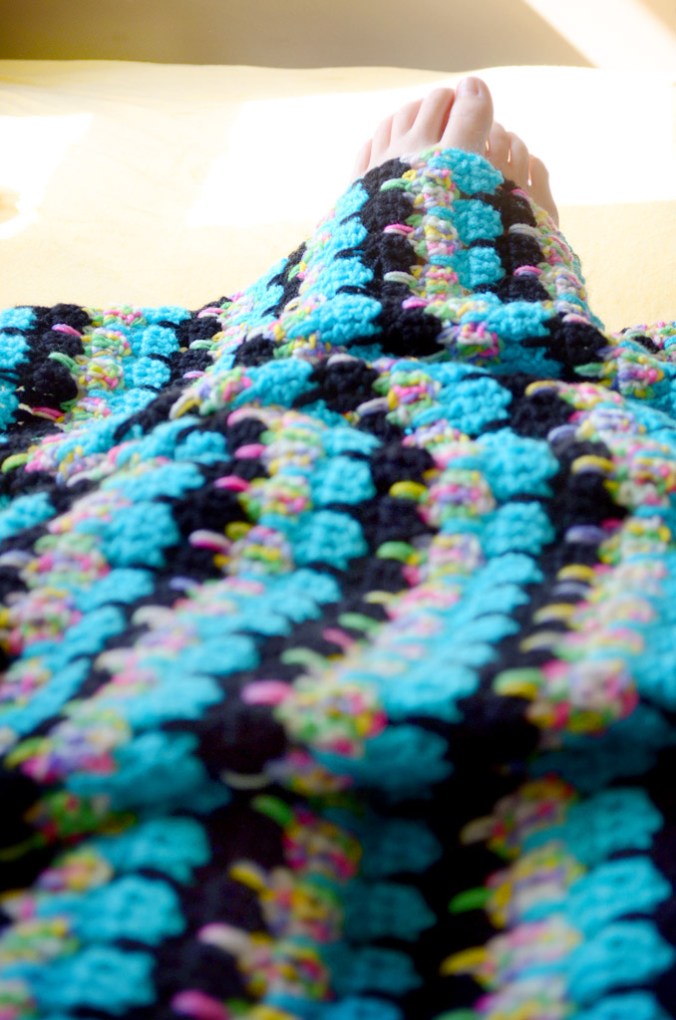 7. I absolutely love your blanket. I love the colors you used, and I also think you have pretty feet. I always notice people’s feet because mine are so funky and crooked after a botched surgery. This doesn’t look difficult just time consuming. Would you mind giving me the patter?