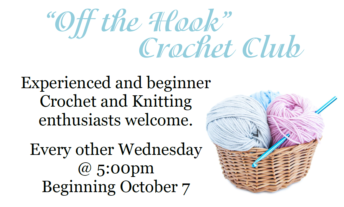 But I am finally going  full-blown cliché by starting up my very own crochet club program. Woo woo! I was first intrigued at my last library because we offered a crochet club, and I’ve always wanted to start one here. Welp, now I finally have the time and ambition. So after some heavy name considerations, and trying to choose the perfect, catchy nom de programme (I like to pretend that I still know French…this probably isn’t even grammatically correct) I decided to start up “Off the Hook” Crochet and Knitting Club! It’s a bi-weekly program for crochet and knitting enthusiasts to meet in the library’s Silent Space and work on their project, start a new one, or if you don’t know the first thing about crochet there will *hopefully* be plenty of happy faces to guide you along the way, including myself.